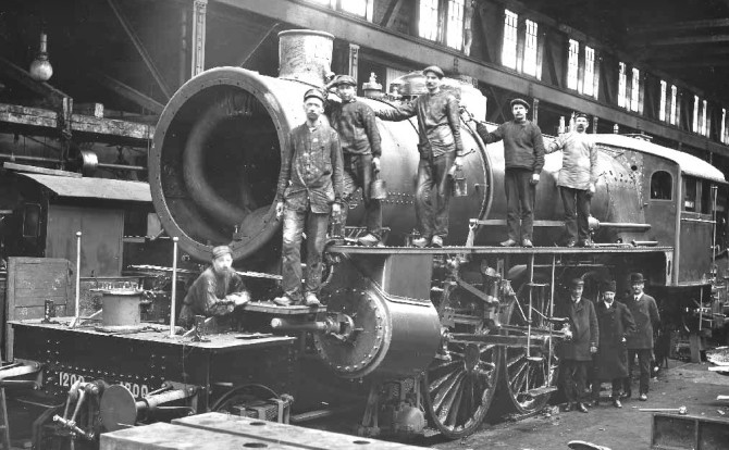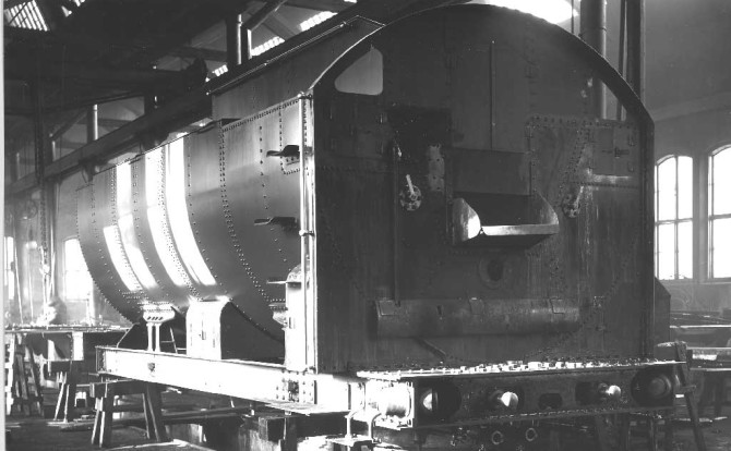 Zwei Bilder zeigen die erste Lokomotive 1914 im Bau. Die 1200 entsteht bei Nydqvist och Holm in Trollhättan. Copyright: NoHAB / Slg. Jänvägsmuseet Gävle
