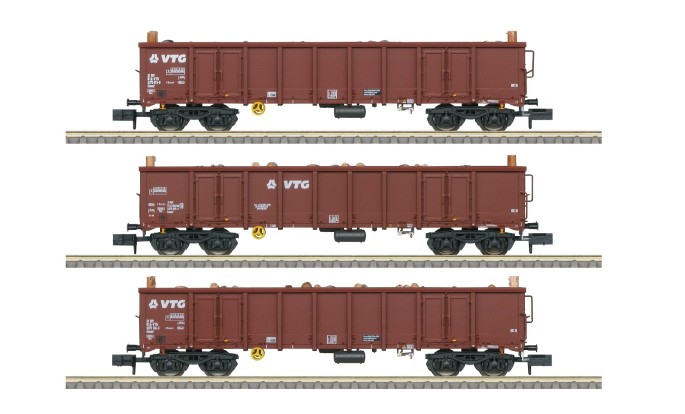 Dieses Set mit drei offenen Güterwagen der Bauart Eanos der VTG, bildet den aktuellen Zustand einiger dieser Wagen nach. Die Wagen werden aktuell oft umgebaut und verlieren dabei meist die rechte Doppeltür. Noch sind die ursprünglichen Wagen mit 4 Türen aber im Verkehr anzutreffen und werden werden vielfältig genutzt. Dieses Set transportiert Rundholz, die Wagen werden aber auch für zahlreiche andere Ladegüter verwendet.