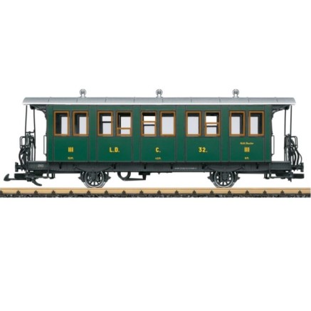 der 2-achsige Personenwagen Nr. C 32 der Landquart-Davos-Bahn in der Beschriftung der ersten Einsatzjahre wie er auch heute noch als Museumswagen existiert.