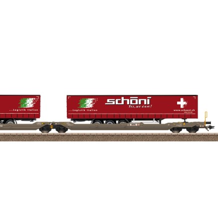 Der Wagen ist mit zwei LKW-Trailern der Spedition "schöni" beladen.